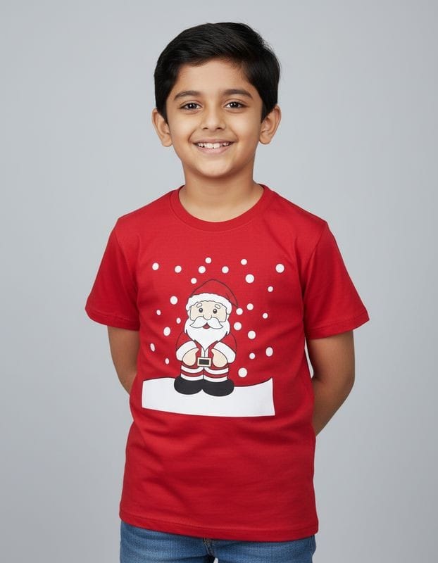 Bright red kids T-shirt featuring a cute Santa design, ideal for Christmas celebrations